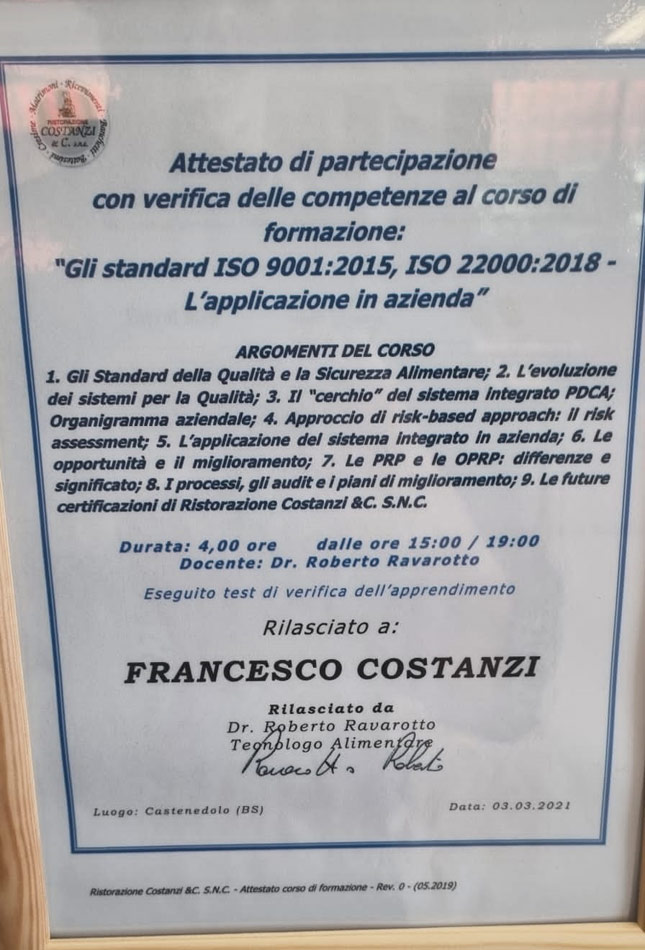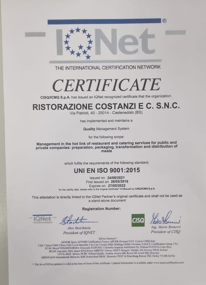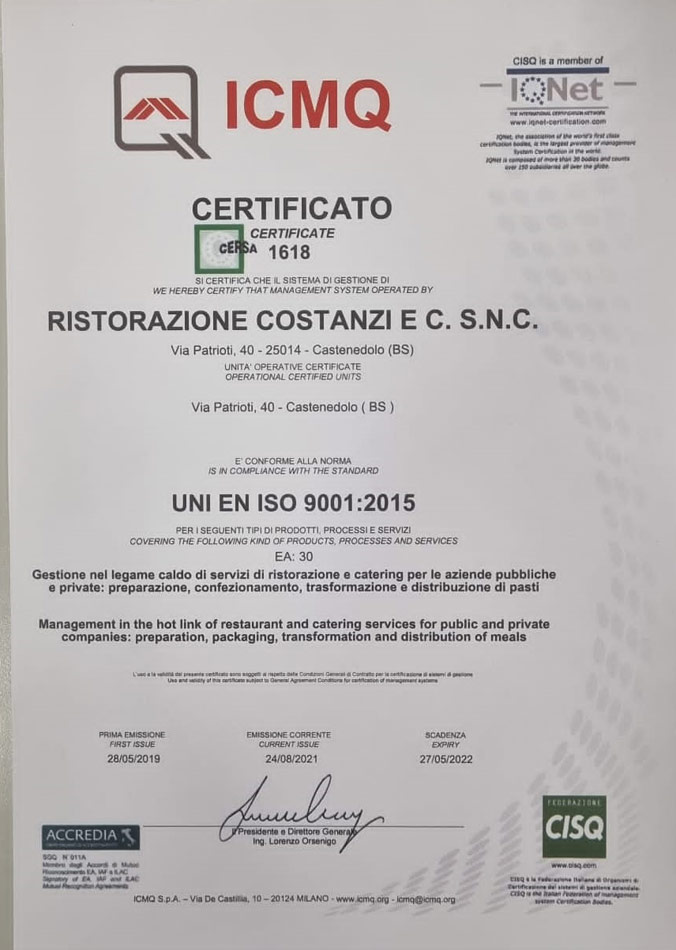 Ci teniamo molto a svolgere al meglio la nostra attività nel campo della ristorazione e distribuzione pasti, per questo ci impegnamo rimanendo aggiornati e certificati con i corsi Iso9001 e successivi pergarantire qualità e competenze certificate.